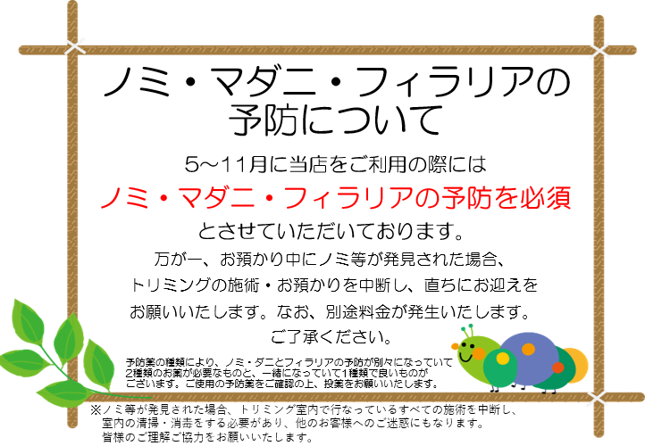 5月〜11月に当店をご利用の際には、ノミ・マダニ・フィラリアの予防を必須とさせて頂いております。